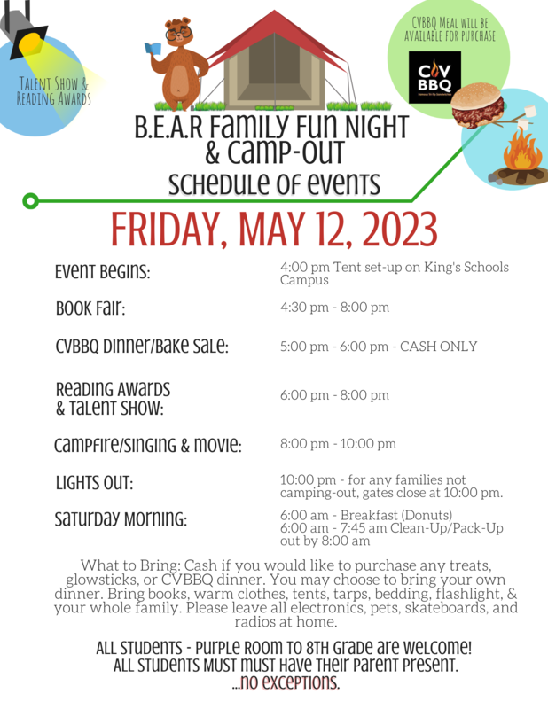 - B.E.A.R. (Be Excited About Reading) NIGHT CAMP OUT & TALENT SHOW: Friday Night, May 12. See flyers attached below.