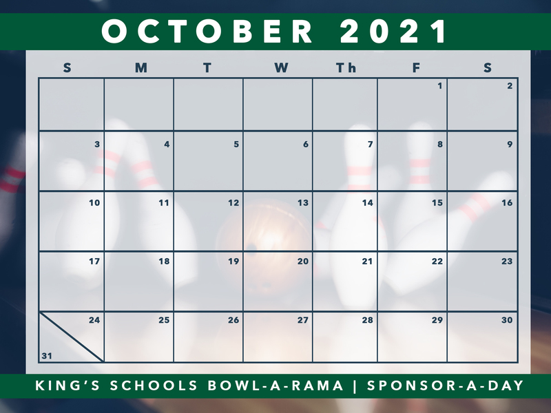 Hi this is <child's name> I am lacing up my bowling shoes where I will be joining my schoolmates at the King's Schools Annual Bowl-A-Rama fundraiser. This event raises money to support scholarships awarded to 100% of the students. I’m doing “Sponsor-a-Day”. You donate the amount of the day you choose. For example if you picked October 12, you pay $12.
