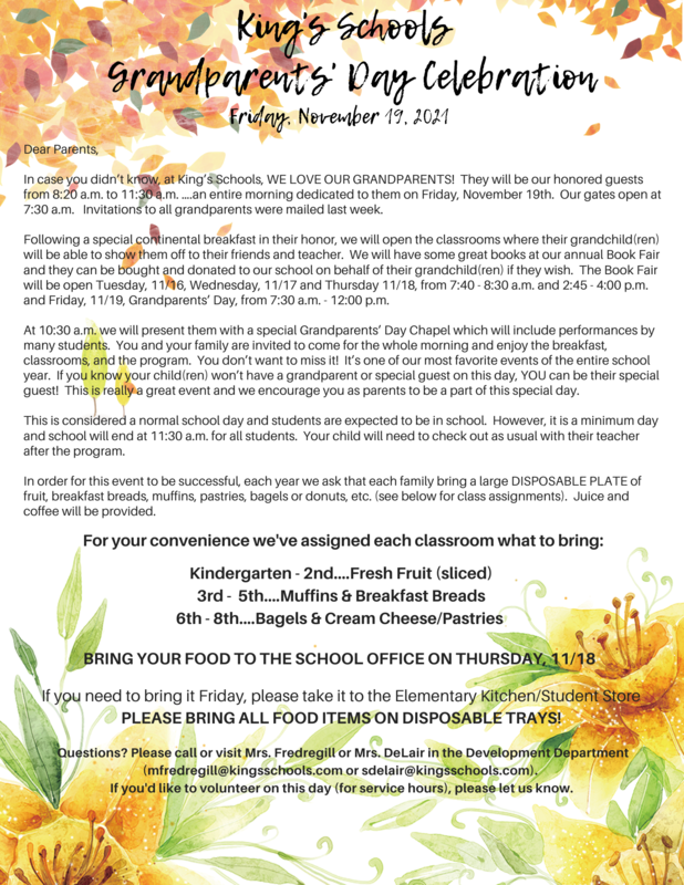 - GRANDPARENTS' DAY: Friday, November 19. 7:30am - 11:30am. A flyer will be sent home with your child today. Volunteers needed. See flyer attached below.
