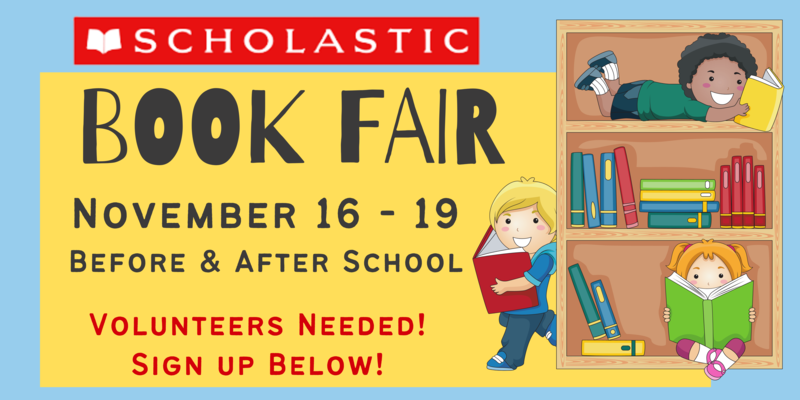 - SCHOLASTIC BOOK FAIR: November 16-19: Volunteers needed. See flyer attached below.