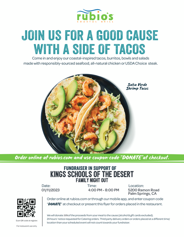 - RUBIO'S FAMILY NIGHT OUT: 4:00pm --8:00pm. 5200 Ramon Road Palm Springs, CA. Flyer attached below.